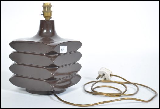 A mid century modernist design table lamp in a rich chocolate brown.  Very heavy piece shaped with chunky layers.  This vintage retro light may well have Scandinavian origins.  Bulb holder is made from brass.Measures 27cms high x 17cms wide x 17cms deep.