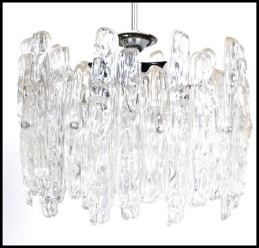 A 1950's mid century retro faux glass resin bark effect chandelier by Kalmar. The outer and inner resin faux glass adorned with 3 bulbs atop and inner to centre. Rewired and ready to use. Measures 48cms high x 34cms