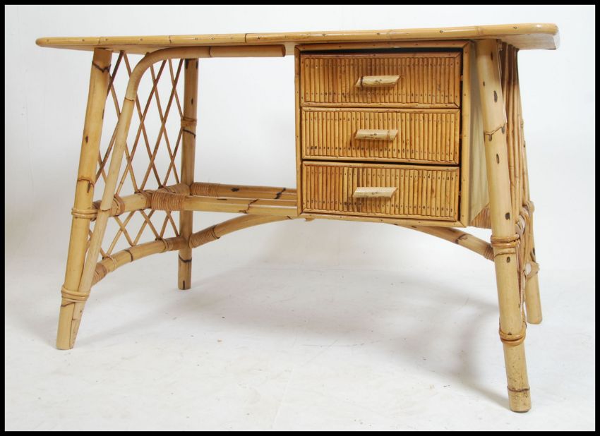 A vintage mid century believed Louis Sognot  (1892-1969) rare bamboo desk. The desk with suspended bank of drawers flanking an open kneehole recess with rectangular top above. Raised on bamboo supports united by lattice stretchers and returns.Measures 73cms high x 113cms wide x 70cms deep.