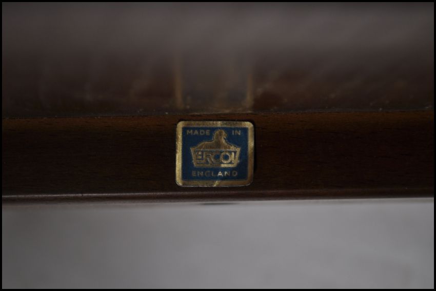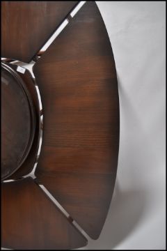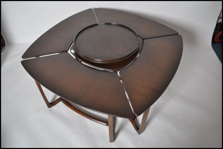 A rare Ercol 20th century elm wood modular table and stools - lazy susan conversation set.The central table raised on squared and canted corner legs united by base stretchers. Above a lazy susan spinning table. Surrounding the central table are a further 4 demi-lune stools - tables. Alternatively a large modular nest of tables. Each item with blue Ercol lion stickers to underside. Measures 50cms high x 115cms x 115cms deep all together as shown in the picture.