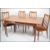 A stunning Kofod Larson for G-Plan teak extending dining table. Raised on tapered support with pierced and chamfered frieze. Above an extending table top together with a matching set of dining chairs with pad seats and railed back rests. Measures 73cms high x 153cms wide x 89cms deep.