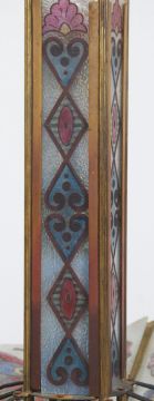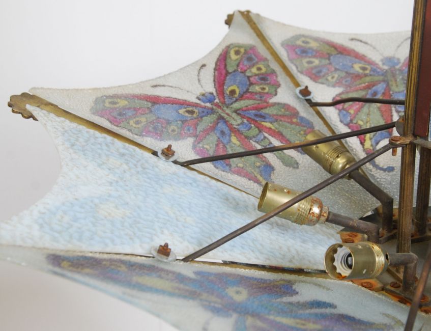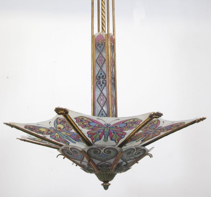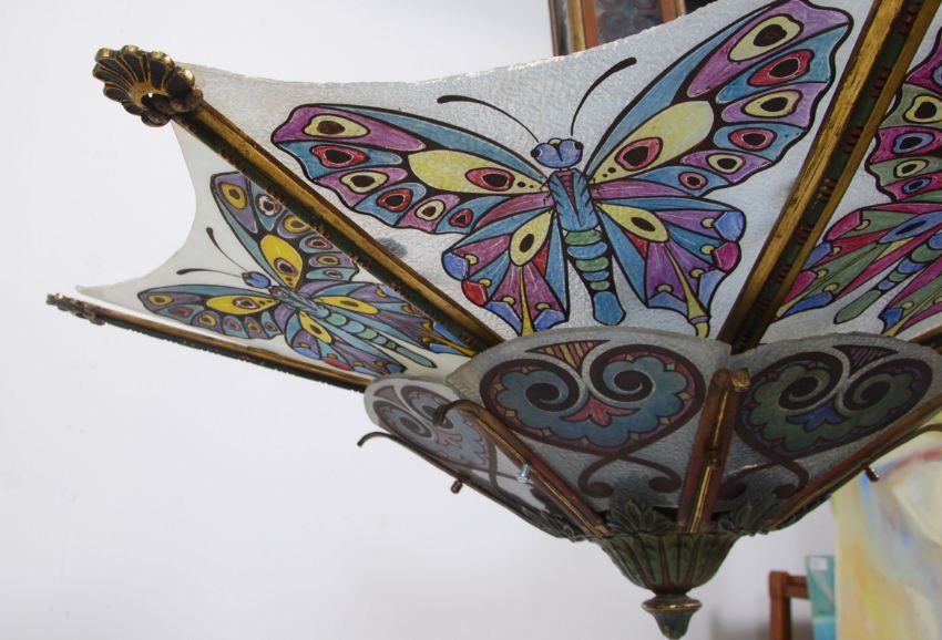 A 1900's Arts & Crafts gilt metal and butterfly glass chandelier. The gilt metal four arm chandelier having butterfly adorned glass panels to the base, the uprights with multiple light heads. The light came from Eardisley House in Herefordshire, it was salvaged from the fire which burnt the house down in 1999. The glass panels having two replacements.  Measures 125cms high x 88cms wide x 88cms deep