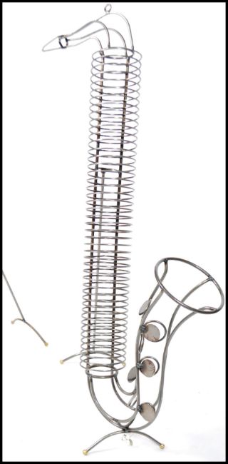 A set of two ' singles ' stands for vinyl records shaped as musical instruments; a guitar and a saxophone.  These high design steel pieces are bespoke designed and made and feature brass ends and trims. They would also be suitable for housing a large number of compact discs CD's. Measures 58cms high x 21cms wide x 21cms deep.