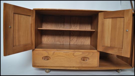 An Ercol 20th century elm wood sideboard of small proportions. The sideboard comprising a series of drawers and cupboards having a solid elm wood chamfered edge top above.Measures 71cms high x  113cm wide x 49cms deep.