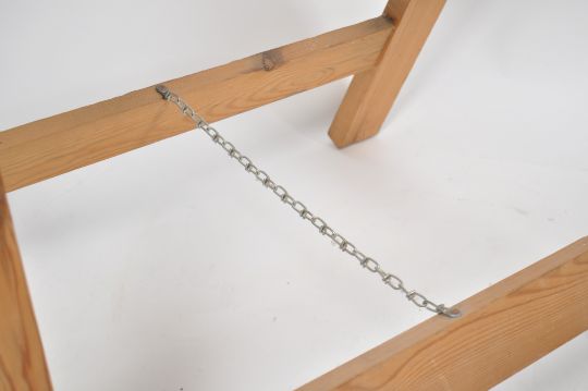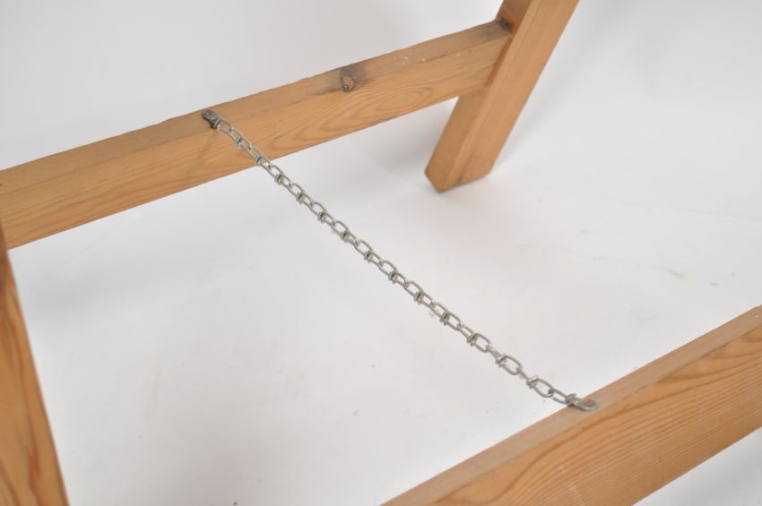 A good set of  ( 3 total ) vintage Industrial wooden trestle table supports - A-frame style being united by chains to the return centre stretchers - ideal for refectory dining tables. The set having smaller trestle same height to centre. Further set in lot 40 Measures 75cms high x 76cms wide x 22cms deep.
