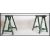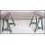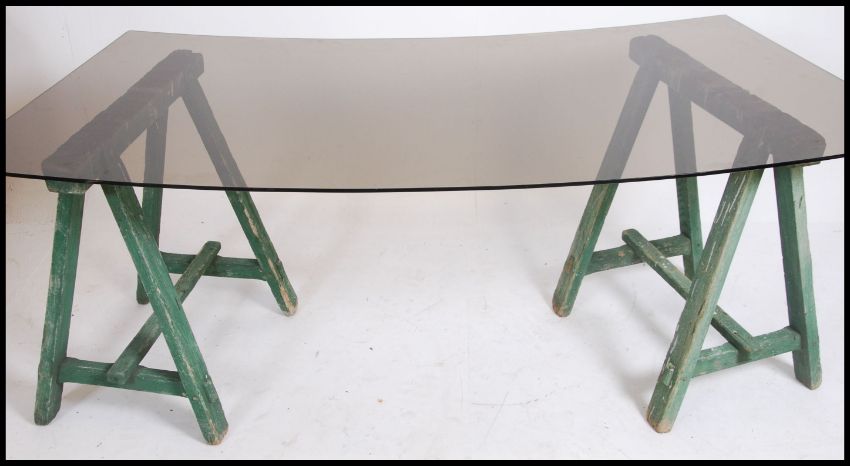 An 20th century upcycled Industrial trestle desk. The desk raised on vintage early 20th century painted wooden trestles having a bow reinforced glass table top above ( see illustrations ) Measures 108cms high x  74cm wide.
