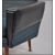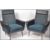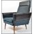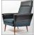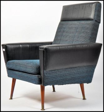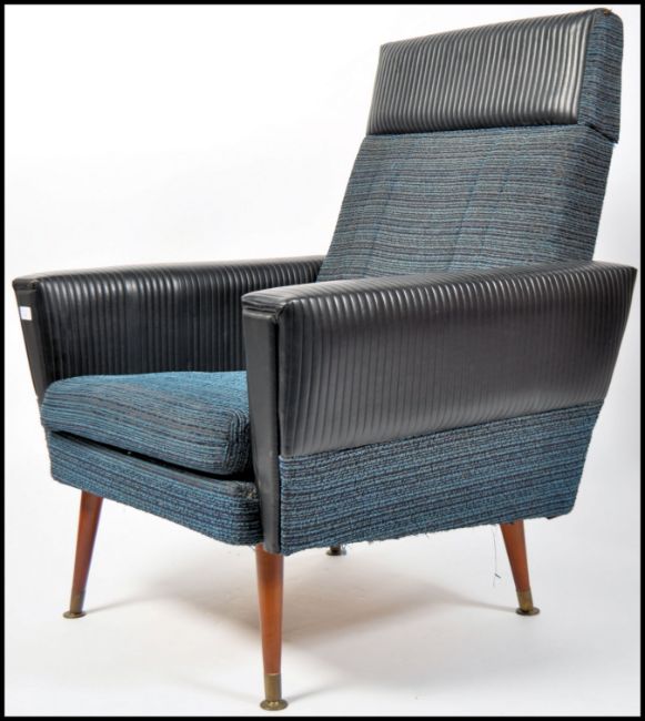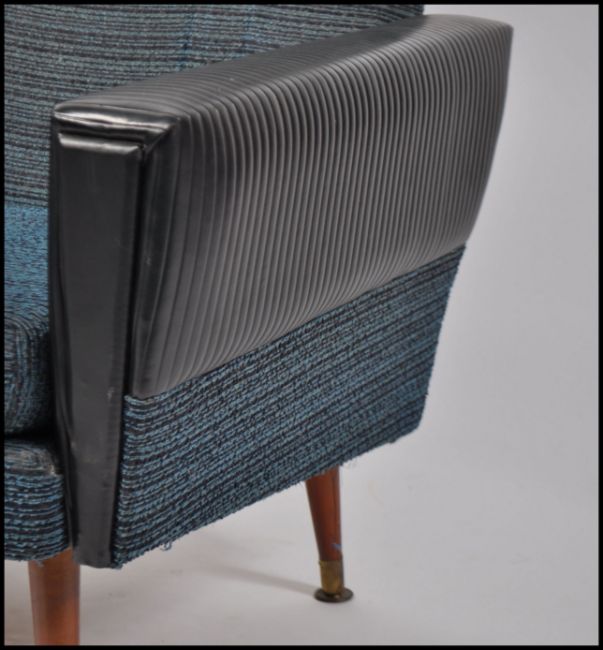 A pair of mid century retro two tone armchairs having black ribbed vinyl and blue moquette fabrics to an angular aeroplane style frame and raised on tapered legs.Measures 96cms high x 77cms wide x 74cms deep.