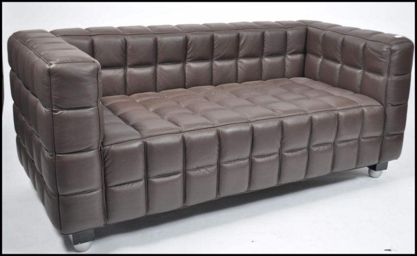 A Scandinavian / Danish revival contemporary brown leather quilt sofa of square form raised on black and turned legs having a squared brown button and quilted effect leather upholstery. Measures 70cms high x 170cms wide x 80cms deep.
