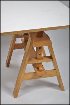 A Modernist Italian Leonardo Zanotta Trestle Table, designed originally by Achille Castiglioni for Zanotta, the varnished steam-treated beech trestles, supports a 2.5cm thick table top coated with white plastic laminate, stamped Zanotta Made in Italy. Measures 76cms high x 200cms wide x 100cms deep.