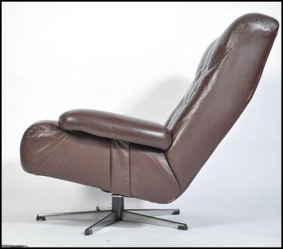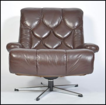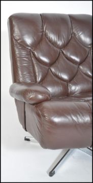 A 1970's  retro 20th century Tetrad brown leather swivel chair / armchair. The chair being raised on a five point chrome base with brown leather deep and wide chair above.