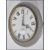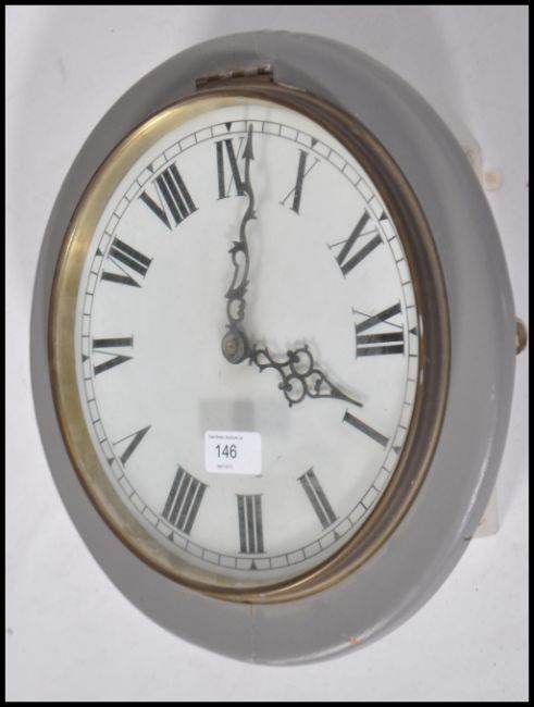 A mid century shabby chic station wall clock with painted grey facia, glass centre with later quartz movement to the rear