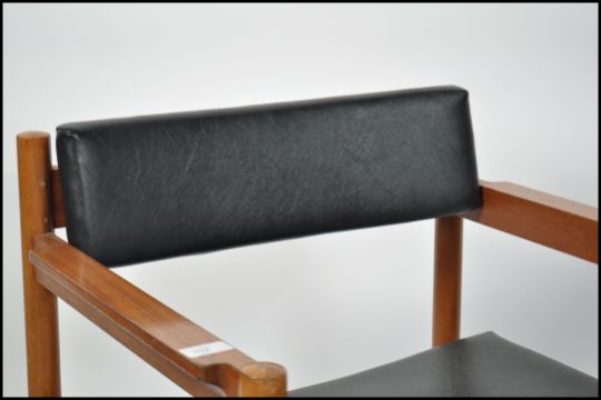 A 1970's Retro Danish inspired teak and black vinyl upholstered War Department - Air Ministry issue armchair. The chair raised on turned legs with black vinyl seats and back rest. Stamped to underside WD. Measures 78cms high x 59cms wide x 54cms deep.