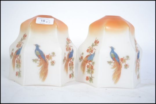 A pair of 1930's Art Deco glass light shades being decorated with birds of paradise and fauna standing 18cm tall.