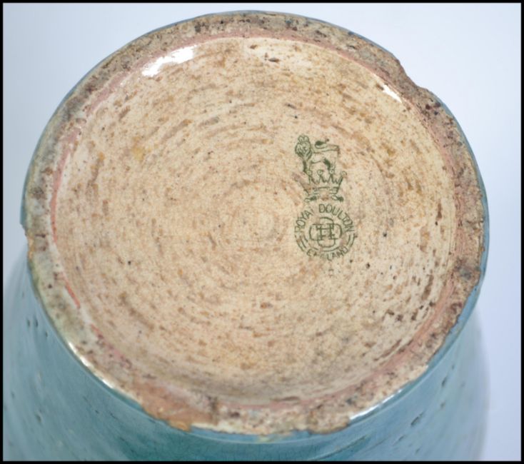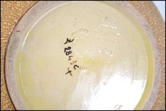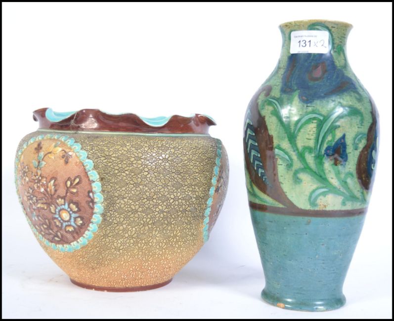 A late 19th early 20th century Doulton Slaters patent floral decorated gilt heightened jardiniere with scalloped rim with impressed stamp to base together with a stunning Royal Doulton stoneware vase decorated in the Art Nouveau style stamped to base. Tallest measures 28cms high.
