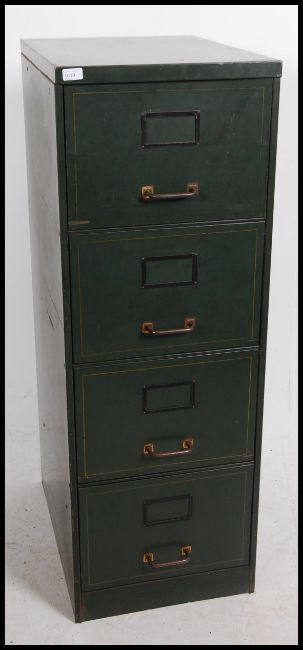 A 1950's mid century green metal 4 drawer filing cabinet with coachlined detail to the drawer fronts having pull handles and notation slides. Measures: 133cms high x 45cms wide x 65cms deep.