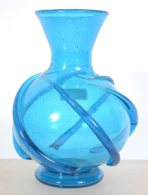 An Islamic blue glass vase with embellished swirl decoration to the bulbous body having waisted and fluted neck. Believed 19th century or earlier