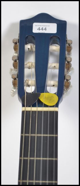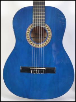 A 20th century Stagg acoustic six string Spanish style guitar finished in blue with carry bag.
