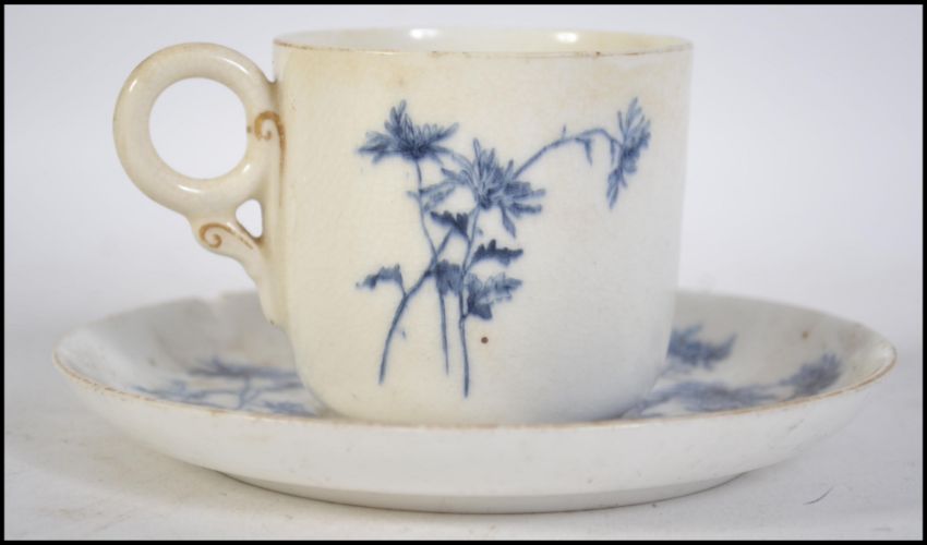 A 19th century Royal Worcester blue and white teacup and saucer having puce marks to the underside for