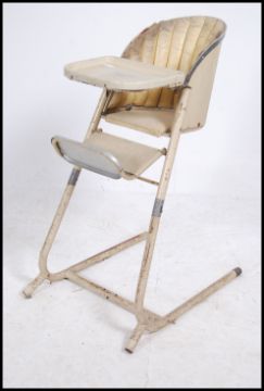 A vintage mid 20th century childs tubular metal framed high chair. Having a padded seat with tray and foot rest.