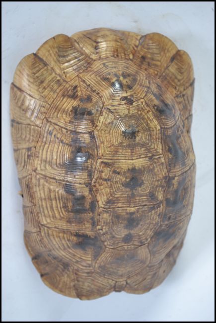 A late 19th century / early 20th century taxidermy tortoise shell, being strung ready to hang. Measures 20cms long.