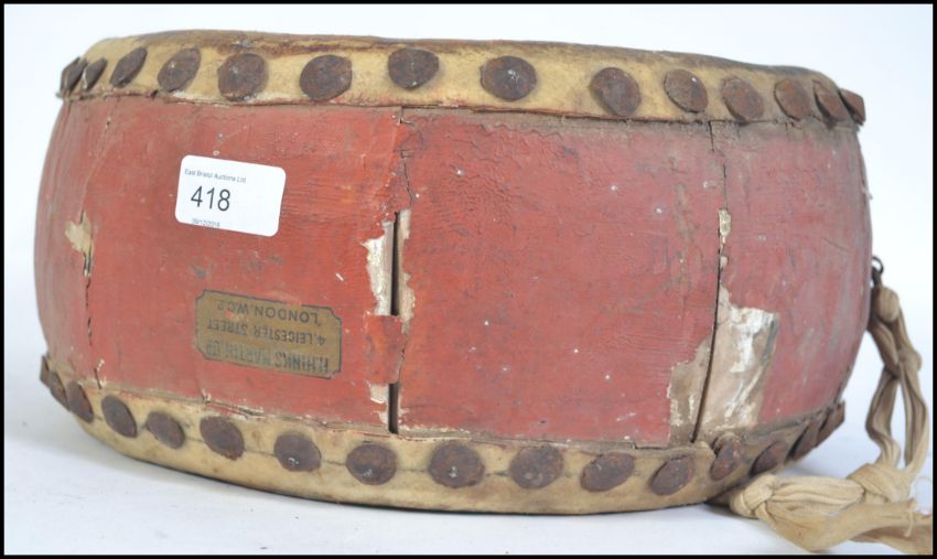 A 20th century Chinese style temple drum having animal hide drum skins painted with flora and dragons. With applied label for H Hinks Martin Leicester Street London WC2. Measures 32cms wide.
