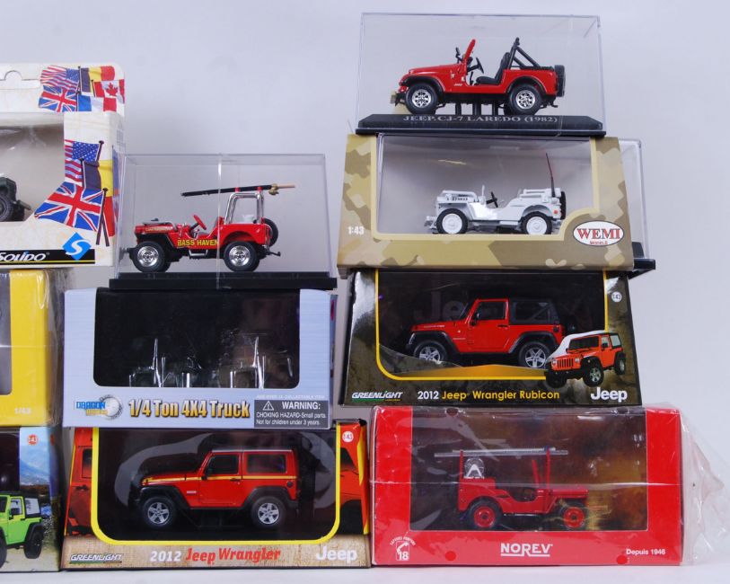A collection of 10x diecast Jeeps by Greenlight Models & Solido. 1:43 & 1:72 scale. Jeeps include; 1978 UN Willys Jeep, 2012 Jeep Wrangler, Depuis 1946, Tour de France Jeep etc.