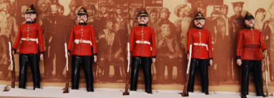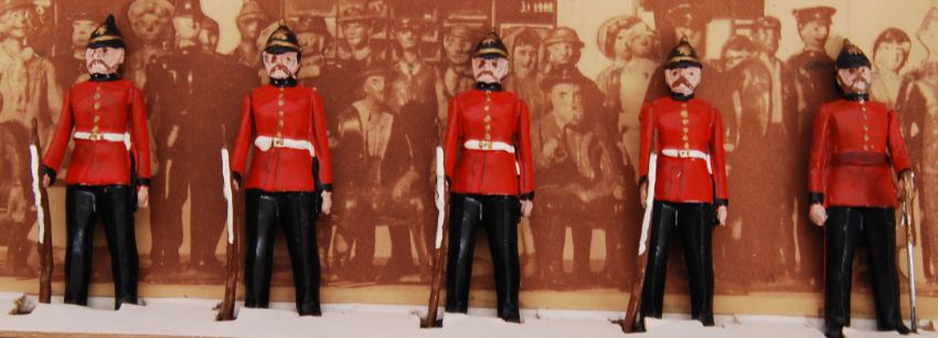 An original boxed set of hand painted lead alloy 54mm white metal Soldiers Soldiers figures. Eight infantry, parade order, at ease, with officer, box 36.