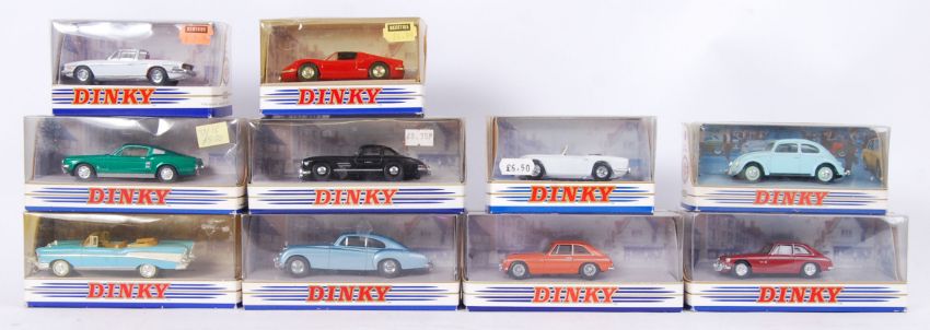 A collection of 10x Dinky Matchbox cars part of the 'Dinky Collection. Cars include; DY-6 1951 VW, DY-20 1960 Triumph, DY-27 1957 Chevrolet, DY-19 1973 MGBGT V8, DY-12B 1955 Mercedes Benz etc. All within original boxes.