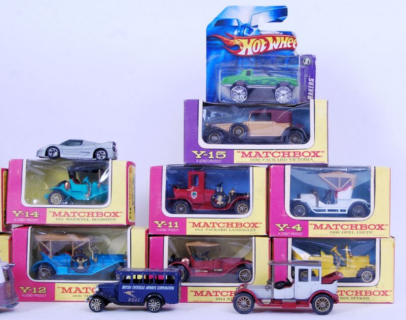 A collection of 13x original Matchbox diecast cars to include Lesney. Vehicles include; Y12 Thomas Flyabout, Y2 Vauxhall, Y3 Benz Limousine, Y11 Packard Landaulet, Daily Express delivery van, BOAC Bus, Chipperfield Circus horse transporter trailer etc.  Mixture of boxed and loose.