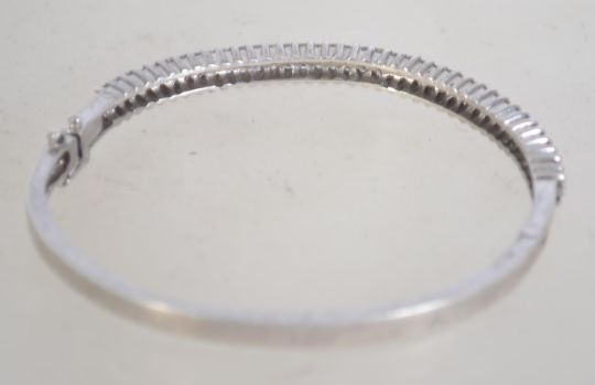 A silver 925 bangle bracelet set with two lines of paste stones. Weighs 16.1 grams measures 6cms wide.