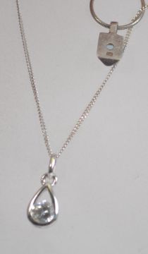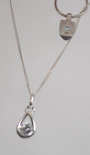 Two silver 925 necklace chains with pendants. One being a snake link chain with spring hoop clasp and a silver pendant with blue stone the other being a curb link chain with a silver tear drop pendant with a clear stone. Total weight 6.8 grams.