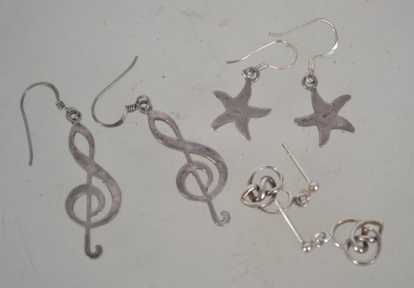 Three pairs of silver 925 earrings to include a treble clef pair, a starfish pair and a heart shaped pair. Weighs 7 grams.