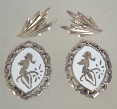 Two pairs of silver earrings one being a silver and white enamel clip on pair marked sterling 925 and the other being in the form of ferns. Total weight 8.5 grams.