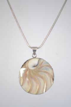 A silver 925 snake linked necklace chain with mother of pearl inset carved pendant in the form of the sun with silver mount. Total weight 18.2g / 18" chain