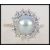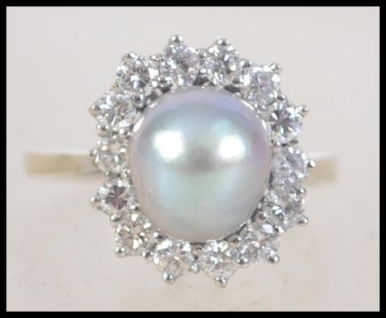 A 14 ct gold pearl and diamond ring with central grey pearl surrounded by approx 70pts halo of diamonds. Size S.5. Total weight 5g. Marked 585 tests 14ct gold.