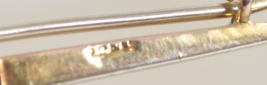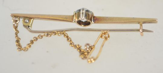 An Art Deco 15ct gold bar brooch with oval cut aquamarine with C clasp and safety chain. Marked 15ct tests 15ct gold. Measures 5.5cms.