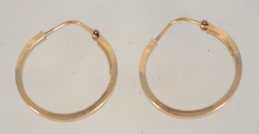 A pair of 9ct gold hoop earrings with etched star decoration and lever clasp backs. Marked 375. Tests 9ct gold. Measures diameter 2cms.