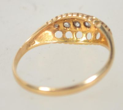 A hallmarked Edwardian 18ct gold and 5 stone diamond ring bearing Chester hallmarks for 1909. The ring with channel set diamonds approx 15pnts total. Size O.