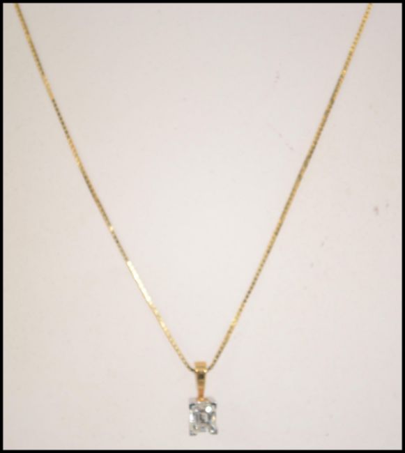 A hallmarked 18ct gold and princess cut diamond pendant necklace. Measures 18 inches. Diamond approx 34pts. Diamond stamp 34. Hallmarked for Birmingham. Weight 2.2g.
