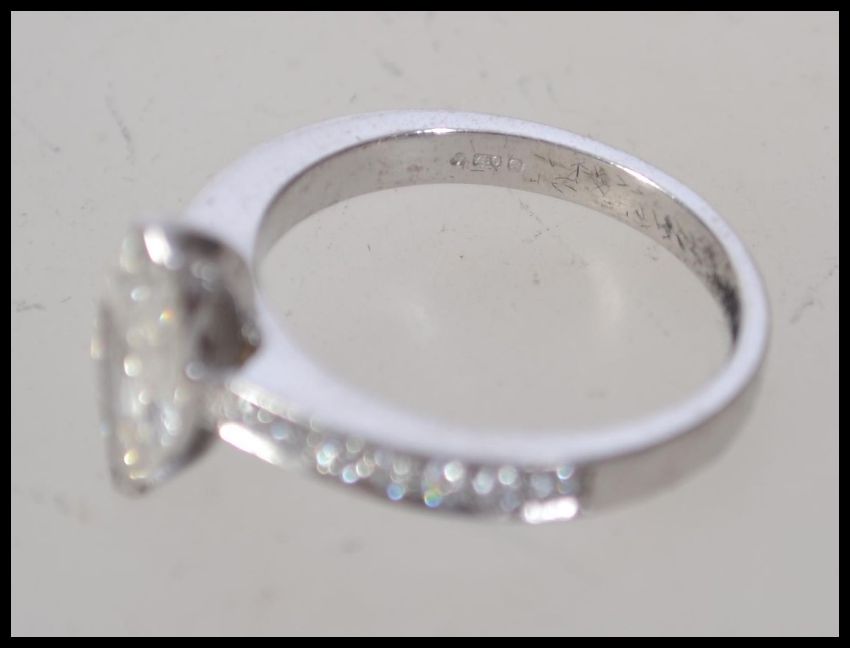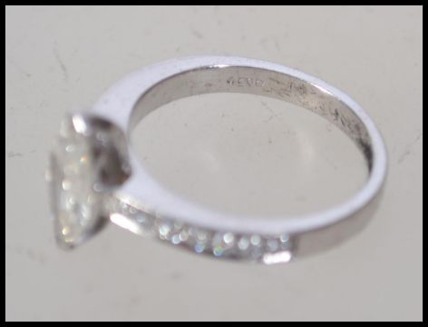A ladies 18ct hallmarked white gold and diamond marquise cut central stone ring having brilliant cut diamonds to the shoulders. Total diamonds approx 1.5cts. Size N / Weight 4.4g
