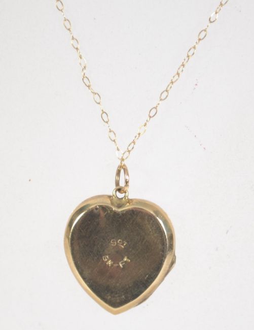 A 9ct gold pendant necklace with heart shaped 9ct back and front locket. Chain marked 9ct. Measures 16 inches.