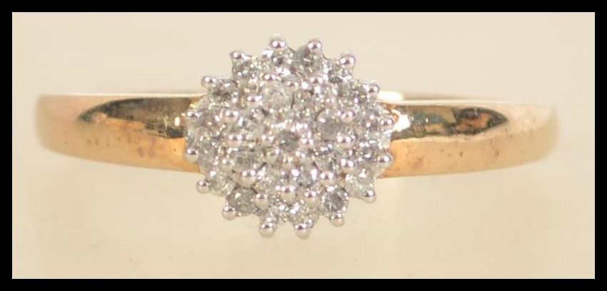 A 9ct gold diamond cluster ring. Hallmarked for London. Weight 2.8g. Size U. Diamonds approx 25pts.
