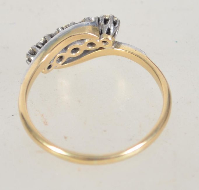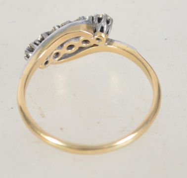 An 18ct gold platinum and diamond 5 stone ring in a cross over design. The diamonds approx 20pnts. Size S / Weight 3.2g marked 18ct and Plat. Tests 18ct gold and platinum.