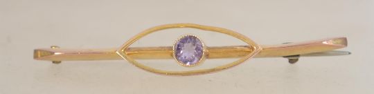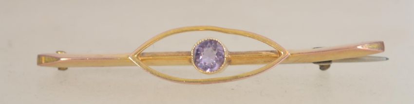 A 9ct gold Art Deco bar brooch with bezel set amethyst with c clasp. Measures