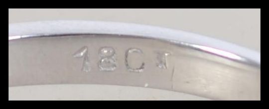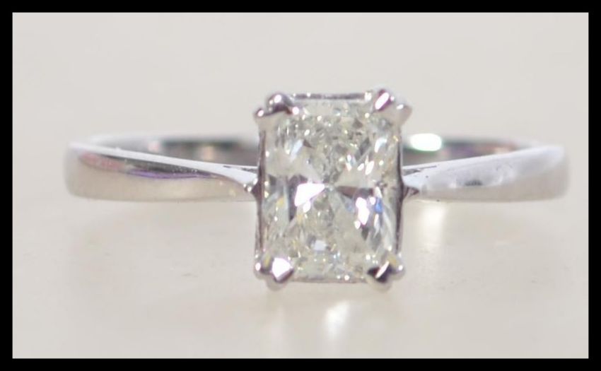 An 18ct white gold emerald cut diamond ladies ring. The diamond approx 1.1cts being claw mounted to a plain shank. Total weight 3.2g / Size O.5. Complete in presentation case