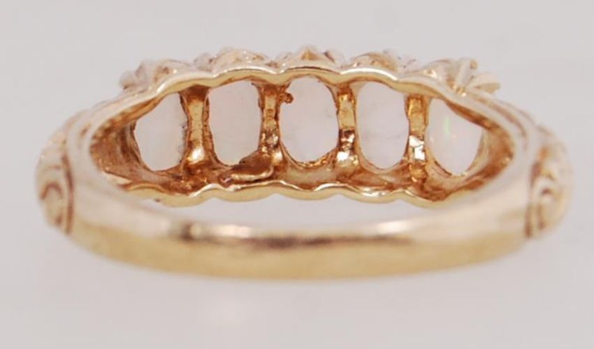 A 9ct gold 5 stone ring set with oval cut opals within a scroll gallery. Hallmarked London. Total weight 3.9g. Size M.