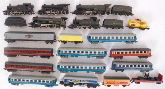 A collection of assorted 00 gauge Lima railway trainset locomotives and rolling stock. All loose, unboxed to include King George V (x2), 42700 locomotive and 5574 locomotive. Various wagons / trailers etc.