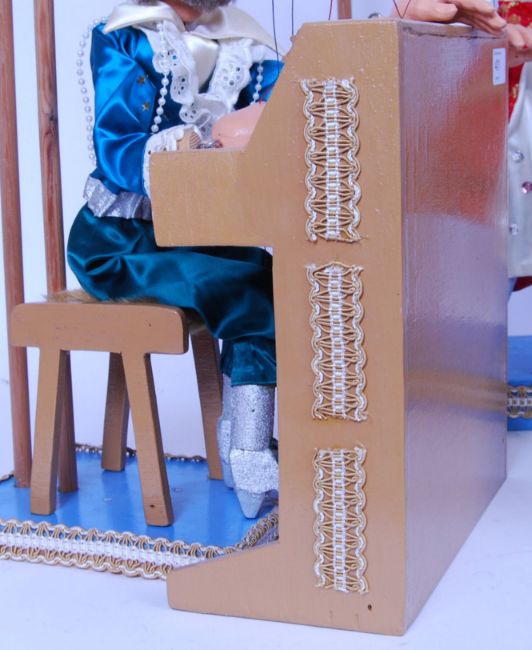 A fabulous rare David Leech of Pelham Puppets made ' Abba ' set of 4x puppets. Each large scale, approx 45 - 50cm tall. Each dressed in period typical 1970's Abba fashion, and each puppet hand painted to match it's respective band member. Benny comes with a stand alone piano and matching fur covered stool, Bjorn with his trademark starburst guitar and jumpsuit. Each puppet comes with its own display 'stage' and hanging frame. The total height of the frame measures 101cm. Undamaged, no breaks or repairs. Rare.