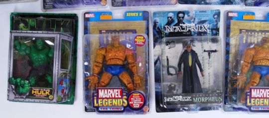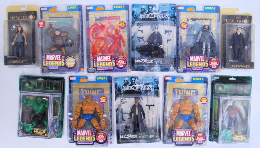 A collection of 11x assorted TV / Film related action figures: 5x Marvel Legends Series I & II, 2x Matrix, 2x Huilk and 2x NECA Twilight Action Figures. All boxed / unused.