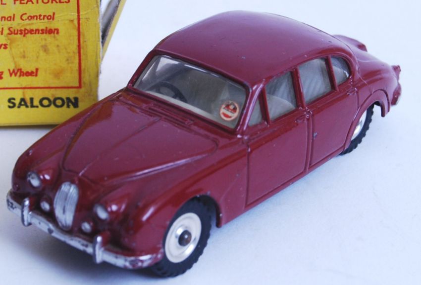 An original vintage Dinky Toys diecast model 195 Jaguar 3.4 Saloon. In burgandy, within the original box.